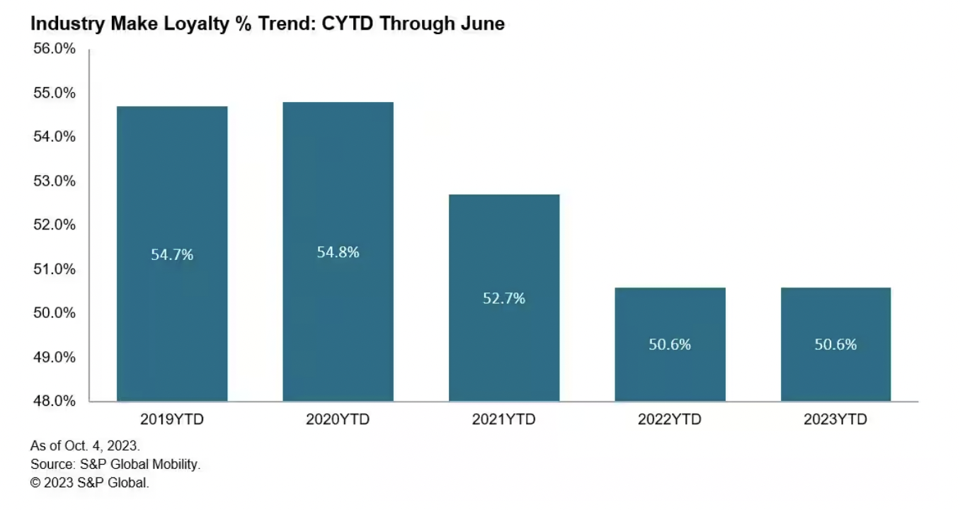 The trend of declining brand loyalty among U.S. consumers, observed in consecutive year-over-year periods, came to a halt in the first half of 2023, as per the analysis of new vehicle registration data by S&P Global Mobility.