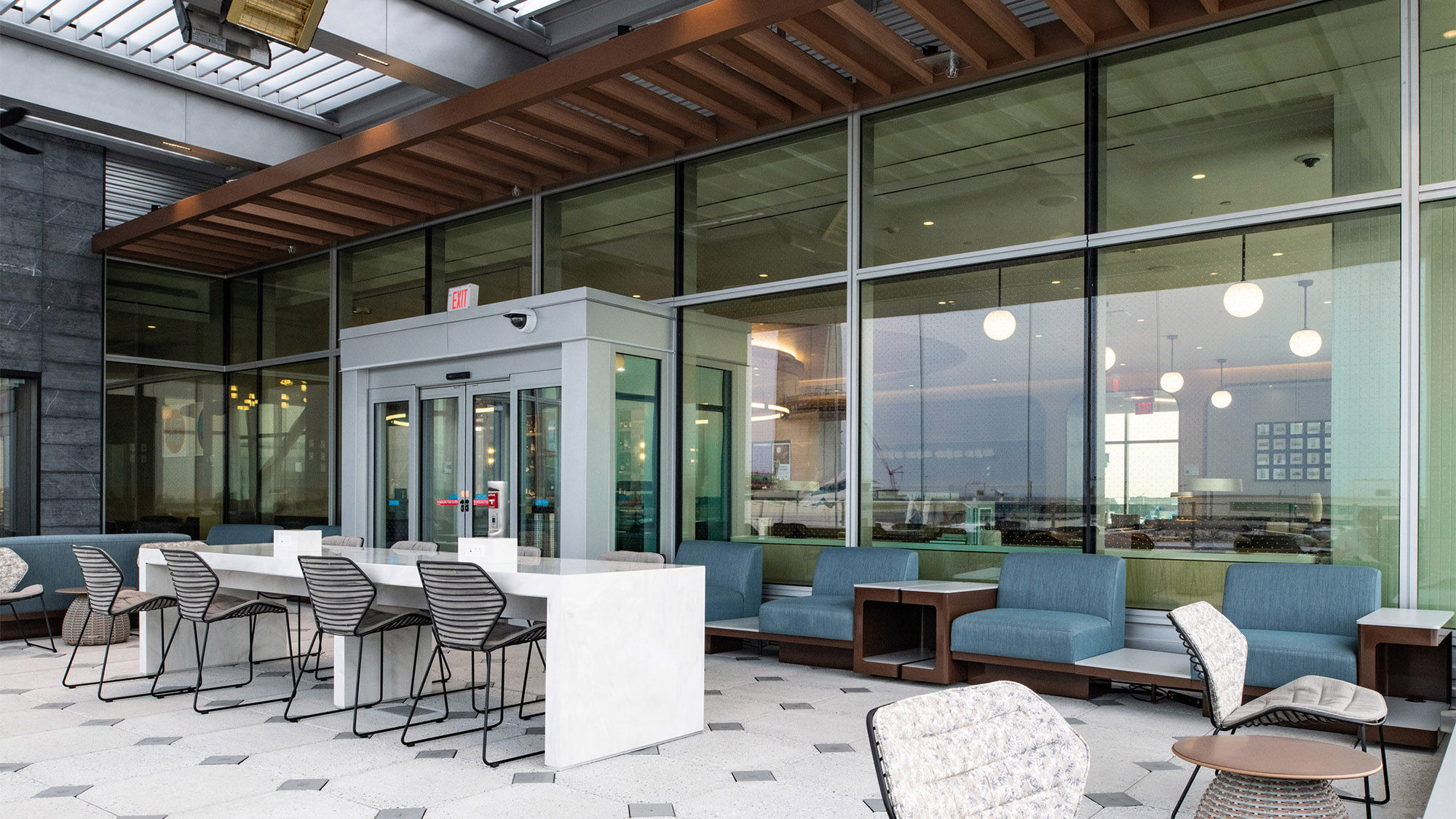 With a stunning view of the JFK airfield, the new lounge spans approximately 14,000 square feet and can comfortably accommodate around 250 individuals. It boasts various amenities, such as a fireplace lounge, a 360-degree bar, and a covered outdoor deck.