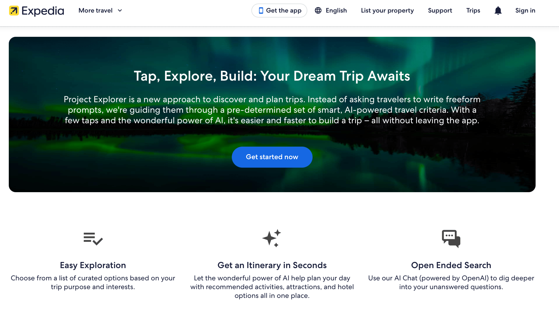 The inaugural project in this space is Project Explorer, a trip planning tool driven by AI, which can be tested on Expedia's mobile app for Apple devices. Project Explorer streamlines the process of discovering new destinations and planning various types of trips by offering tailored options based on interests, location, season, and budget. It delivers recommendations rapidly, complete with information, visuals, suggested accommodations with pricing details, and recommended activities.