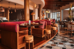 Hand-woven latilla ceilings, terrazzo floors embellished with hand-cut inlaid local stones, custom wall tiles and structural ceiling beams made from Mexican teak transport guests into a visual expression of the cuisine’s origins, bringing together balanced, Japanese-inspired sculptural forms with bold, Peruvian-inspired colours and textures.