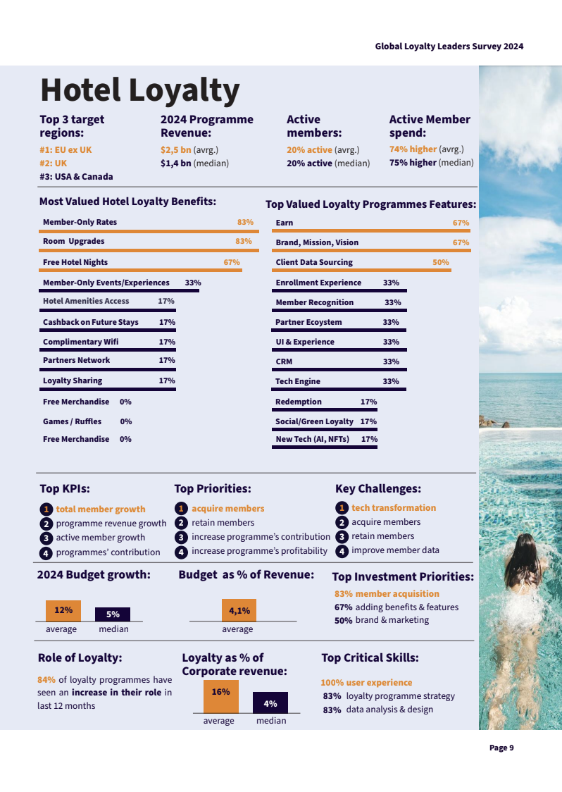 The report evaluates the current state of loyalty programmes by benchmarking their benefits, features, profitability, budgets, KPIs and other parameters critical to run a large modern loyalty programme. It provides insights into organisational integration, such as how loyalty programmes align with corporate strategies and their influence on C-level decision-making. Additionally, it identifies emerging trends and key investment priorities, offering a roadmap for loyalty teams to align their programmes with broader organisational goals. The report delivers 50+ pages of detailed KPIs and data invaluable to Heads of Loyalty and wider loyalty teams in their work to innovative and up-to-date loyalty benefits, features and investments.