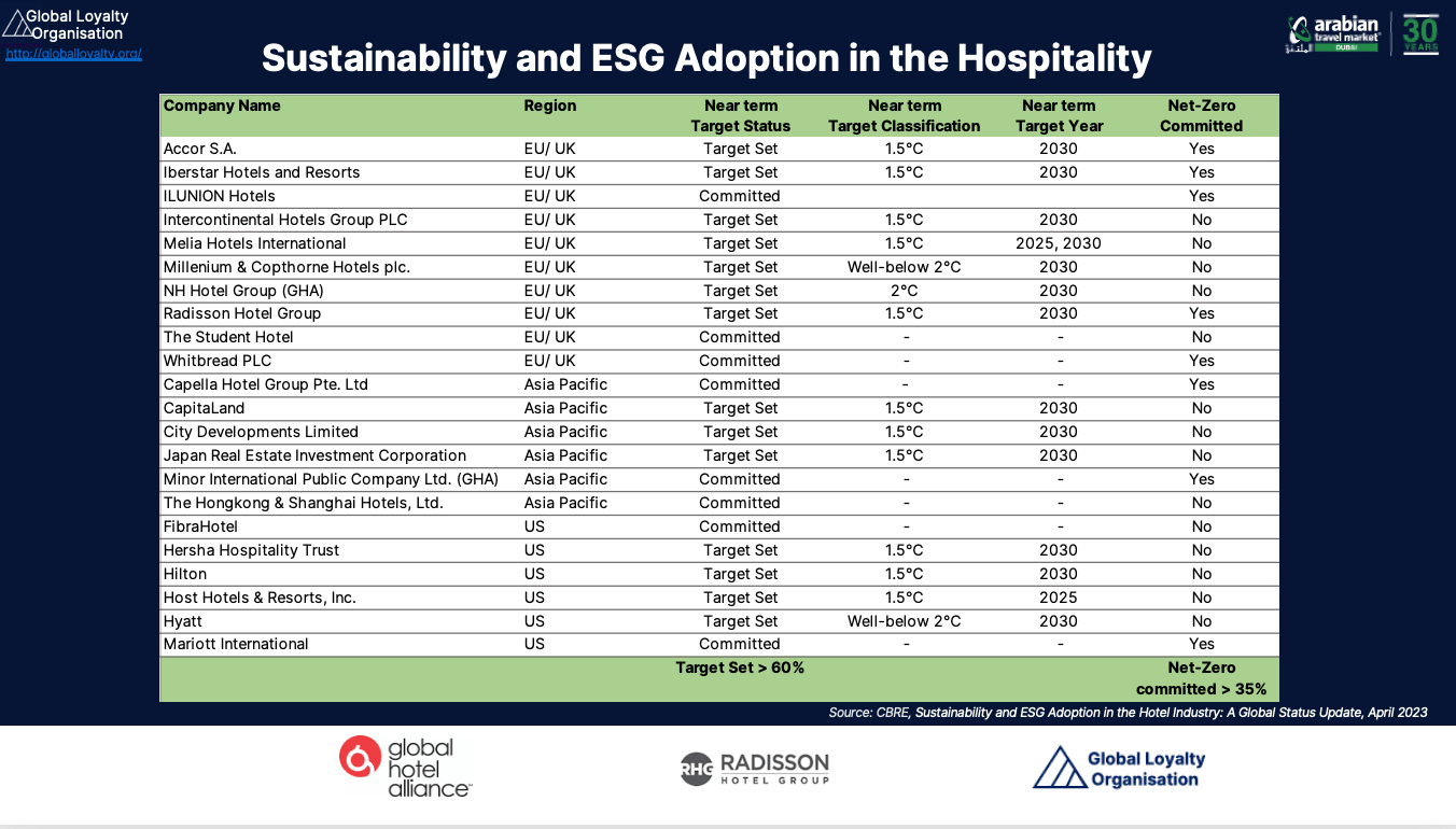 There was some research in the early 2000s, which quoted that hospitality is just awakening to sustainability. I think that actually refers to Inge’s point that the first programme or the first steps were taken in 1989 by Radisson, but now hospitality is firmly actively pursuing sustainability. And I would say that we are probably halfway to reaching the goal of setting up net zero hospitality. The customers are no longer asking to do no harm. They rather ask you to do good. And that’s the opportunity for the panel to highlight how the hotel groups are taking active steps. If we quickly look at where the largest global hotel groups are: Currently, over 60% of the global hotels already have set the target of the Paris Accord 1.5 degrees achievement. And that’s quite a near-term target from a business perspective. With regards to net zero commitment, which is a much harder target for businesses to achieve over 35% of hotels already committed. And you can see that our panellists Radisson and GHA, are definitely among the leaders. With that, let’s pass on to the first question.