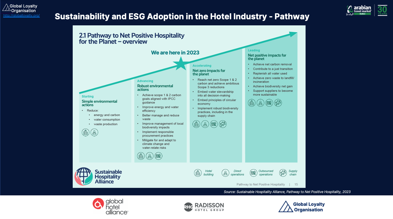 Inge Huijbrechts: Yes, with pleasure. I just want to clarify, what I was talking about with hotels’ sustainability basics is not a Radisson initiative. It’s something that the hotel industry did. So we united the big players, many were mentioned today already. We united destinations, we united the Hotel Associations of India, and groups in China and Thailand and everywhere to be part of this. And we set ourselves the difficult task to say ‘what are the essential points that any hotel should start with?’ And of course, I think there is a saying, “Give me time to write a short letter. It will take me longer.” So, I don’t know how it goes exactly, but the point is, if you try to reduce criteria to the essentials, it’s going to be quite an exercise. We came together with these hotels. We had 12 founding companies who were part of it to say what are these basics. We have them around three key topics, efficiency, planet and people. We aligned these definitions with the United Nations Sustainable Development Goals. And we aligned them also with the GSTC criteria for eco labels. So in that sense, it’s a starting point that can lead to much more. So in efficiency, it’s the typical ones of reducing your energy measuring and reducing energy, measuring and reducing water, measuring and reducing your carbon footprint and identifying and reducing waste. On the planet side. It’s the things that the guests want to see in the guest experience. When you travel to hotels, you don’t want to see single-use plastic straws. You don’t want to see the mini toiletry bottles. Maybe you want to see vegetarian meals in the food and beverage offerings. So those kinds of things are included. And then on the social side, it’s everything about reducing inequality, promoting responsible tourism in the destination and making community contributions. So those together make 12 of the essential criteria. But I just want to add that I’m very happy that you’re showing the pathway to net-positive hospitality. Because there you can see there are four clear steps for any hotel that wants to advance on sustainability. And the first one is hotel sustainability basics. The next level is for example a full eco label. The next level is net zero hotels, and we all want to aspire to be net positive – to give back more than we take. And that journey is a collective journey that the hotel industry is on so many companies like Radisson Hotel Group. We actually have hotels that are on each part of the journey, I would say. But we want to get everybody along and operate within our commitment of achieving net zero.