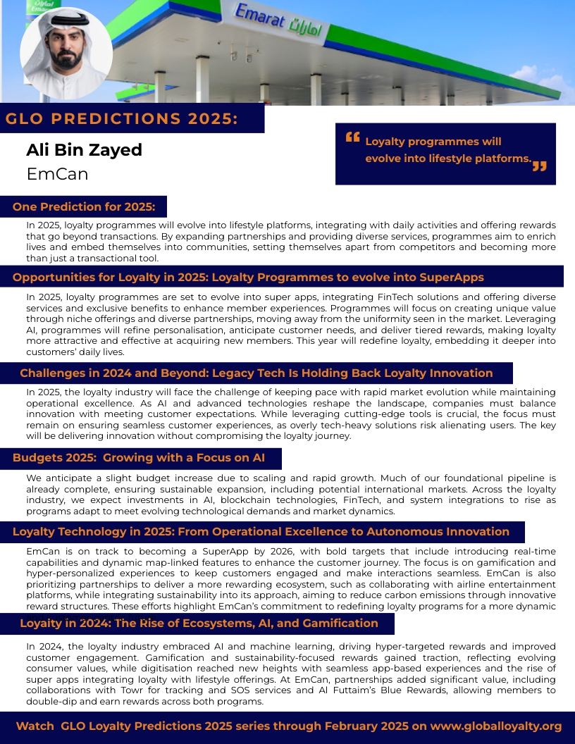 GLOThird interview of GLO’s 3rd annual Loyalty Predictions 2025 series. Insights from Ali Bin Zayed, Senior VP of Marketing, Emarat, to discuss the key trends shaping loyalty in 2024, the opportunities and challenges ahead, and how technology will redefine the industry in 2025.
