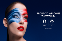 The company is running a promotional campaign featuring a young woman wearing make-up in the colours of the French flag, accompanied by a welcome message from the 39,000 Air France staff – “proud to welcome the world to France”.