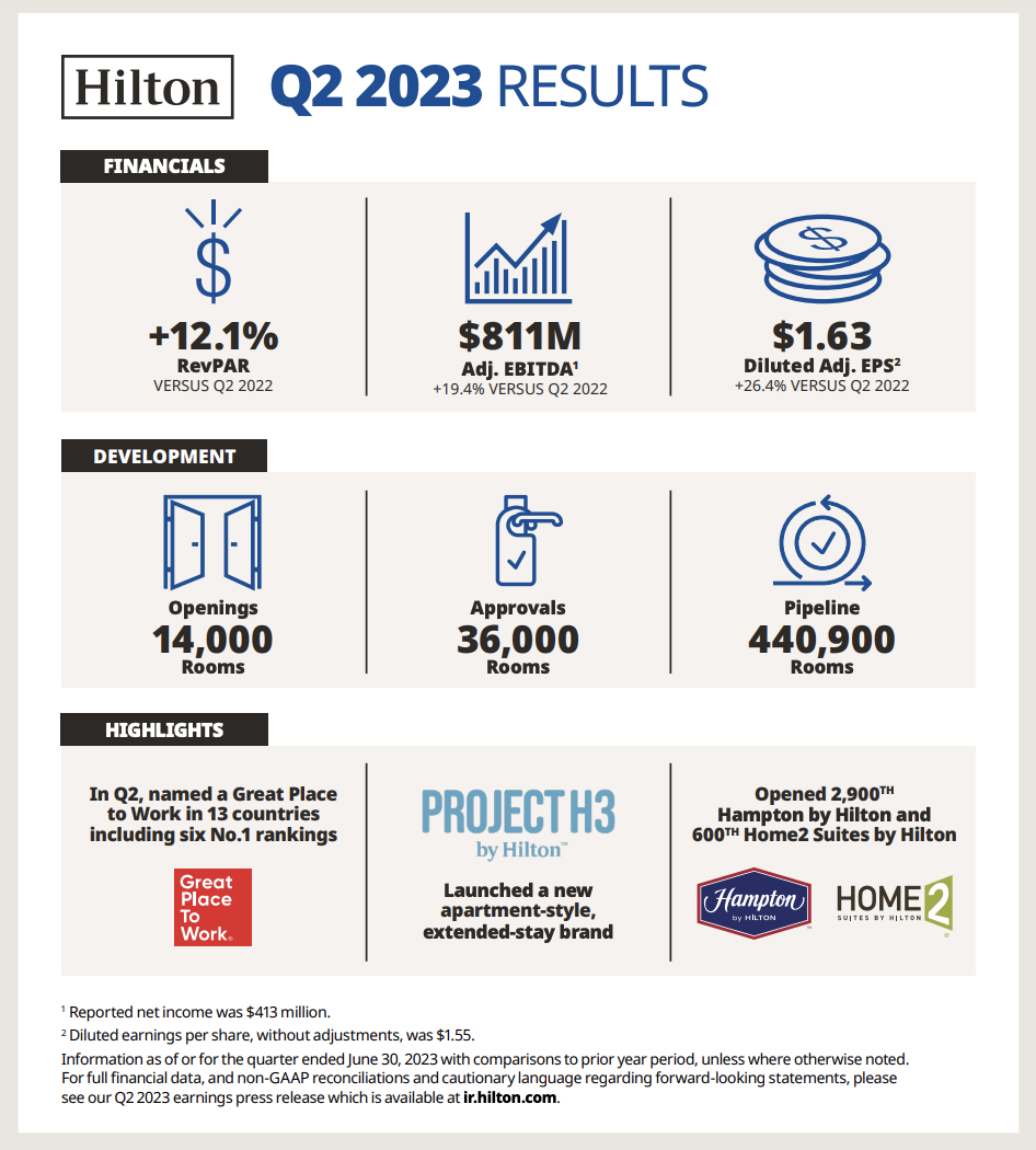 Hilton Worldwide Holdings Inc. reported its second quarter 2023 results. Diluted EPS was $1.55 for the second quarter, and diluted EPS, adjusted for special items, was $1.63, both exceeding the high end of guidance. Net income was $413 million for the second quarter, exceeding the high end of guidance.
