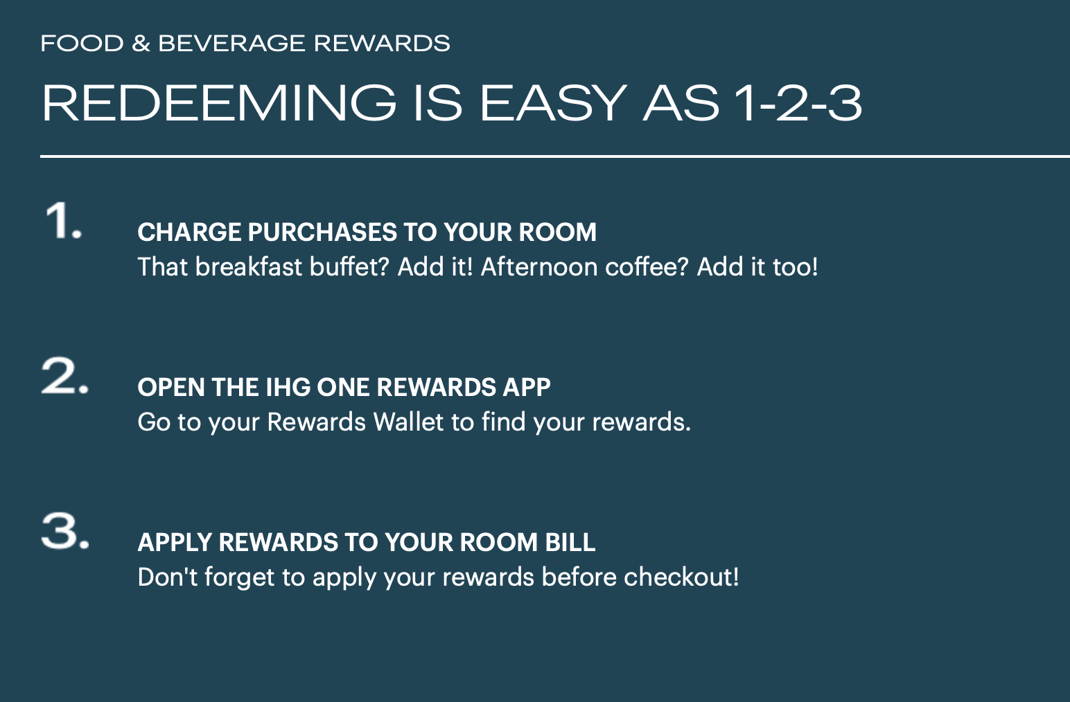 Food & Beverage Rewards can now be used at selected Luxury, Lifestyle, and Premium IHG hotels in the US and Canada.**