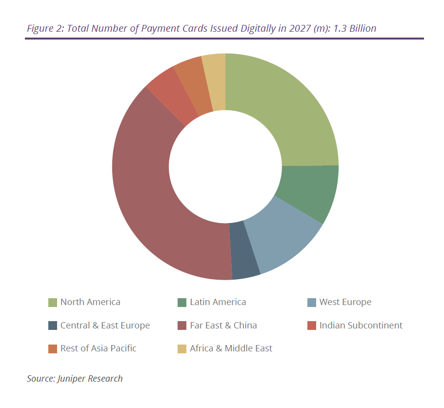 - Far East Asia & China to account for close to 40% of the total number of payment cards to be issued digitally in 2027.