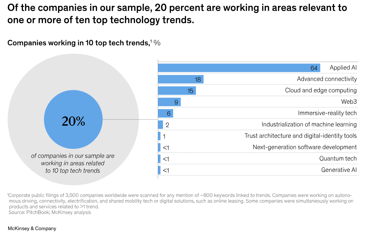 The report indicates that a significant portion of companies (20%) are actively involved in developing products or services aligned with these trends, with many having secured substantial investments for their initiatives. These companies exhibit strong financial performance, collectively receiving funding exceeding $200 billion. Notably, a majority (64%) of these entities are focusing on applied AI applications or technologies empowered by applied AI, making it the predominant technological trend in the mobility sector.