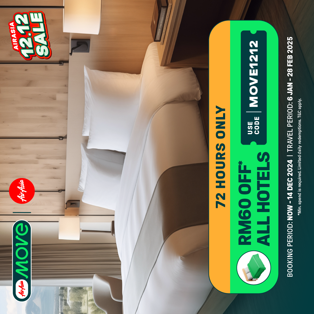 AirAsia MOVE users can also enjoy RM60 OFF* on hotel bookings worldwide during the promo period by using the promo code MOVE1212, with a minimum spend of RM400.