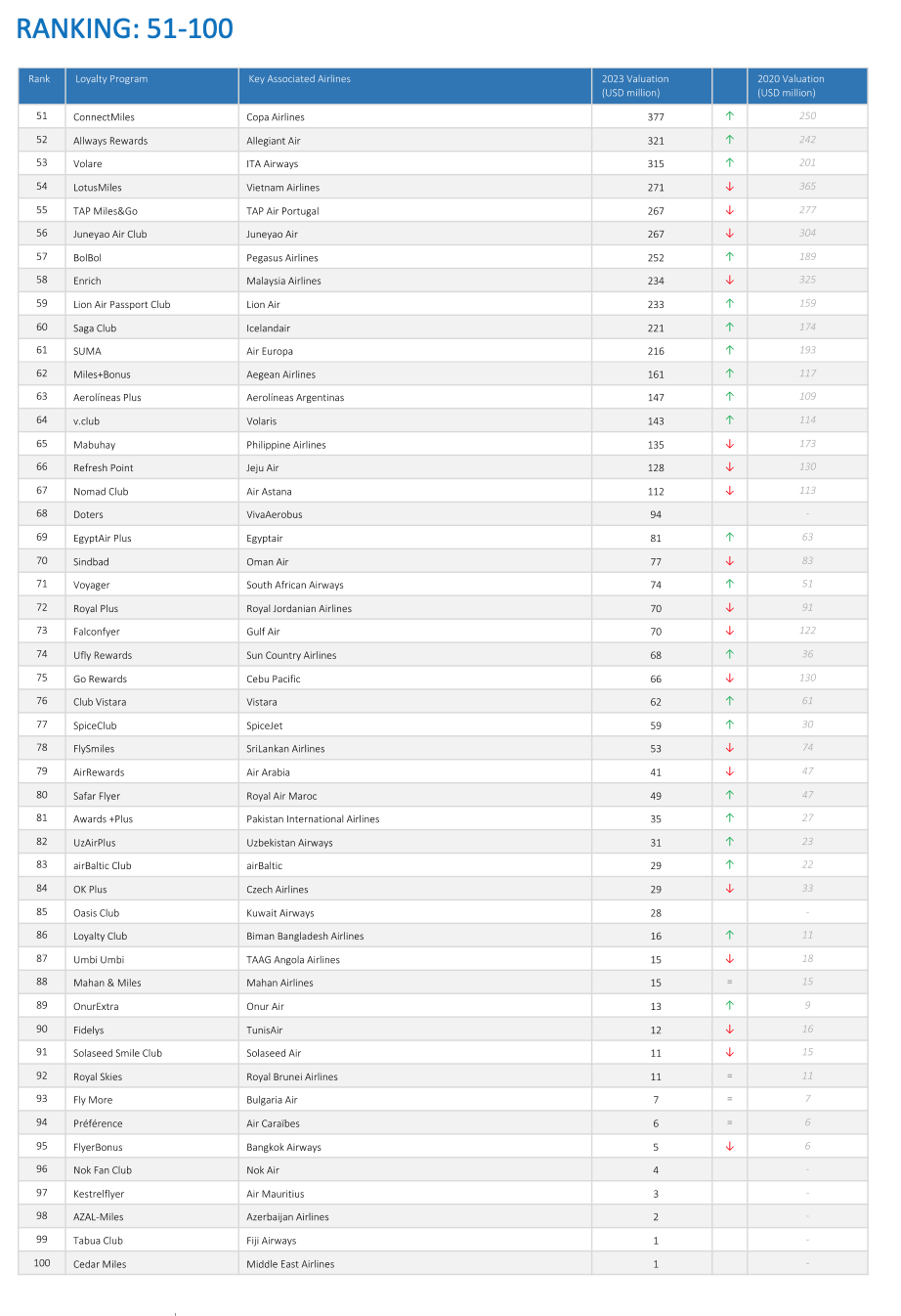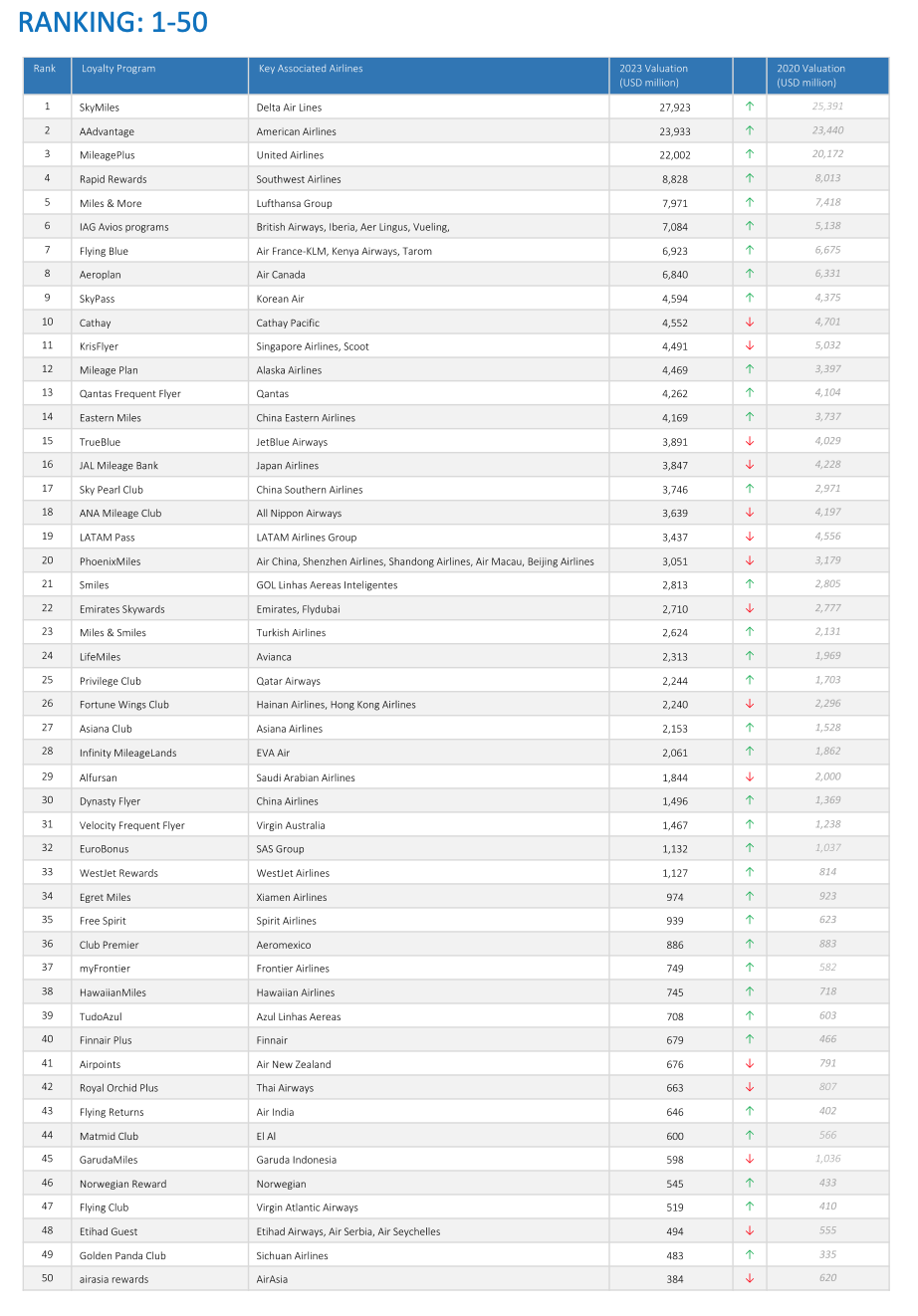 Based on publicly available sources and reported financials, the report ranks top 100 most valuable airline loyalty programs with top 4 out of 5 places dominated by the USA airlines: 1) Skymiles (Delta), 2) AAdvantage (American Airlines), 3) MileagePlus (United Airlines), 4) Rapid Rewards (Southwestern) and 5) Miles & More (Lufthansa).