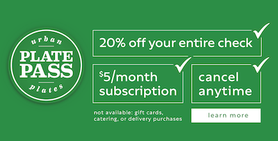 Plate Pass can only be purchased through the Urban Plates app or at urbanplates.com/platepass. Members can use their Plate Pass membership for in-store and take-out orders from the register, website, or app. The 20% discount is not valid for gift card purchases, delivery, or catering. Members can buy up to 15 entrees at one time, on one check. For more information and to sign up for the new Plate Pass, visit urbanplates.com/platepass.